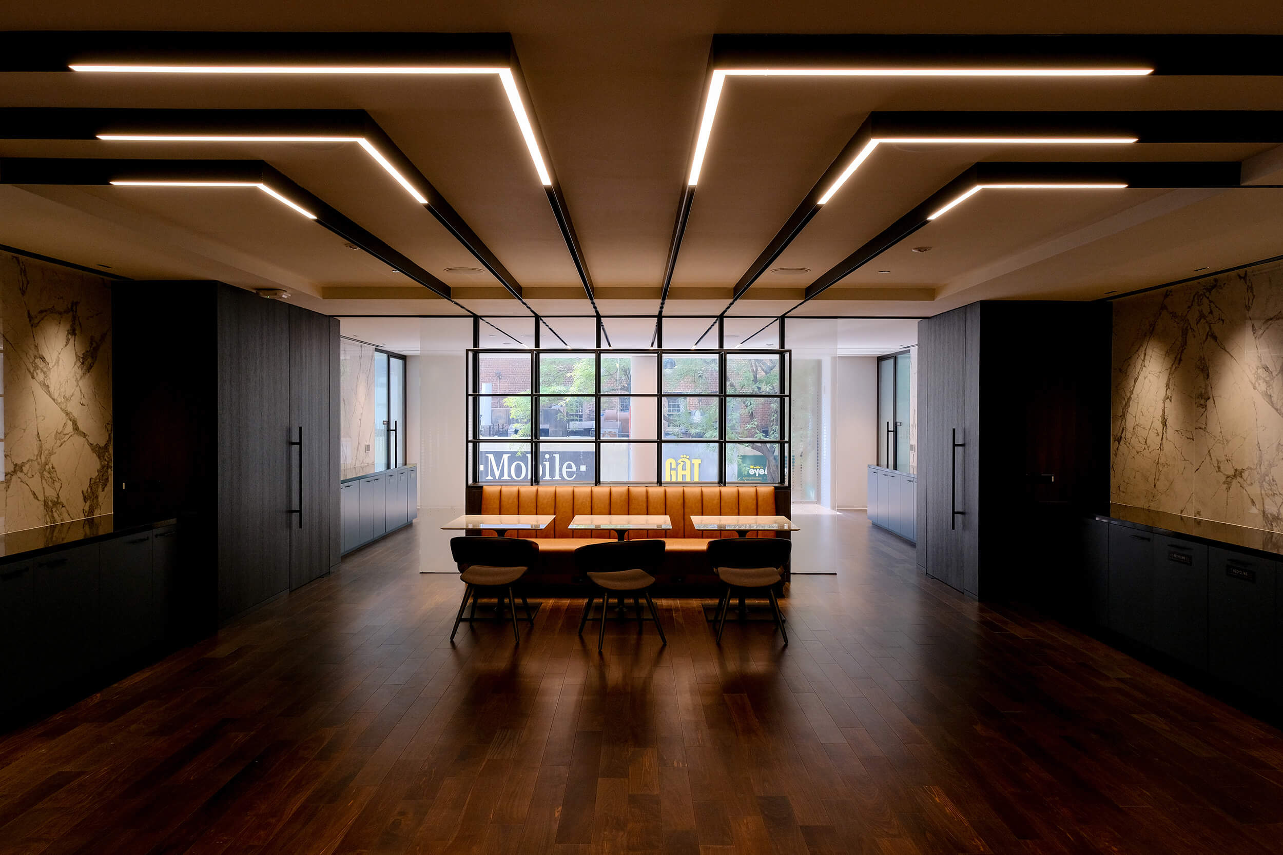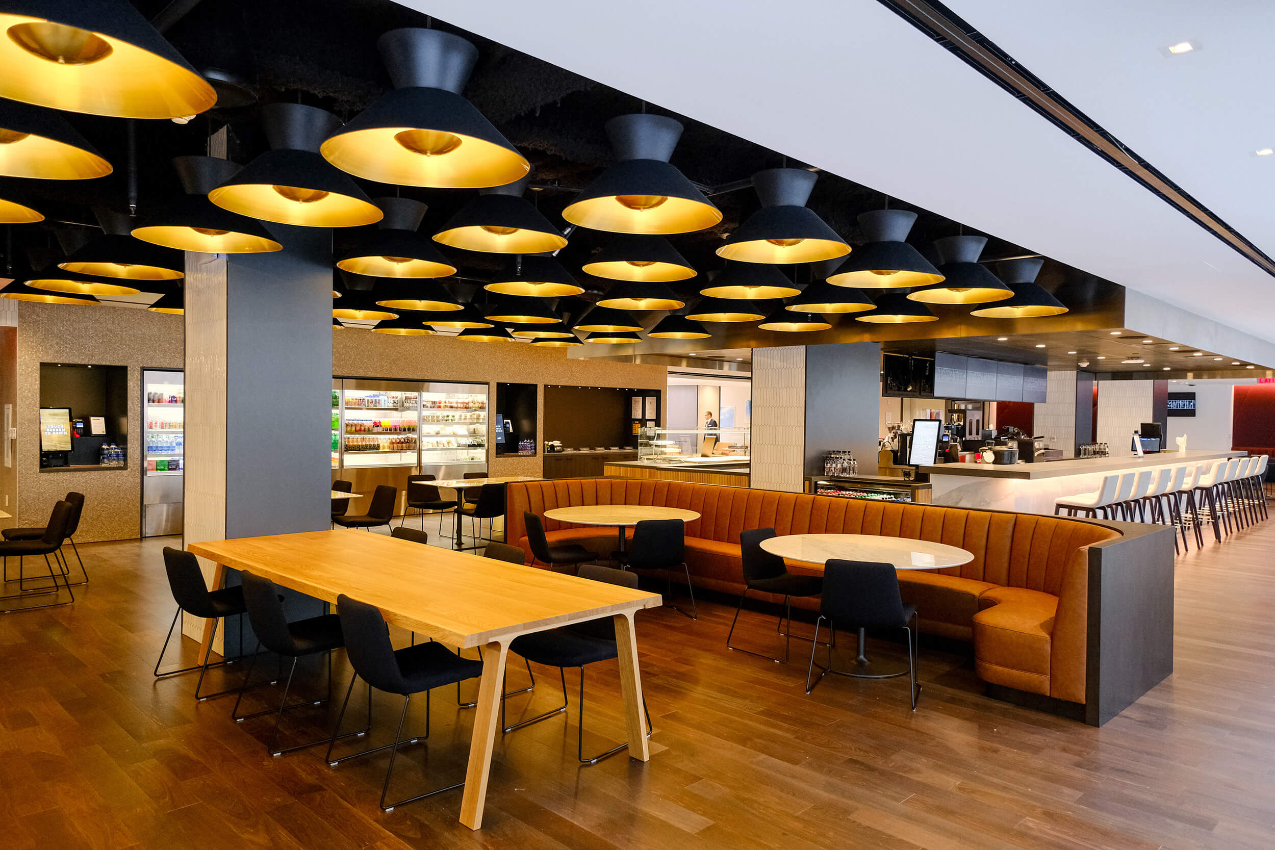 Catering to flexible work schedules, rotating vendors serve this 9,000-square-foot dining experience, which features a central counter staffed with a barista, self-serve stations, and grab-and-go options, as well as a centralized pickup for outside delivery services. Available to all appetites all day, and also for after-hours events.