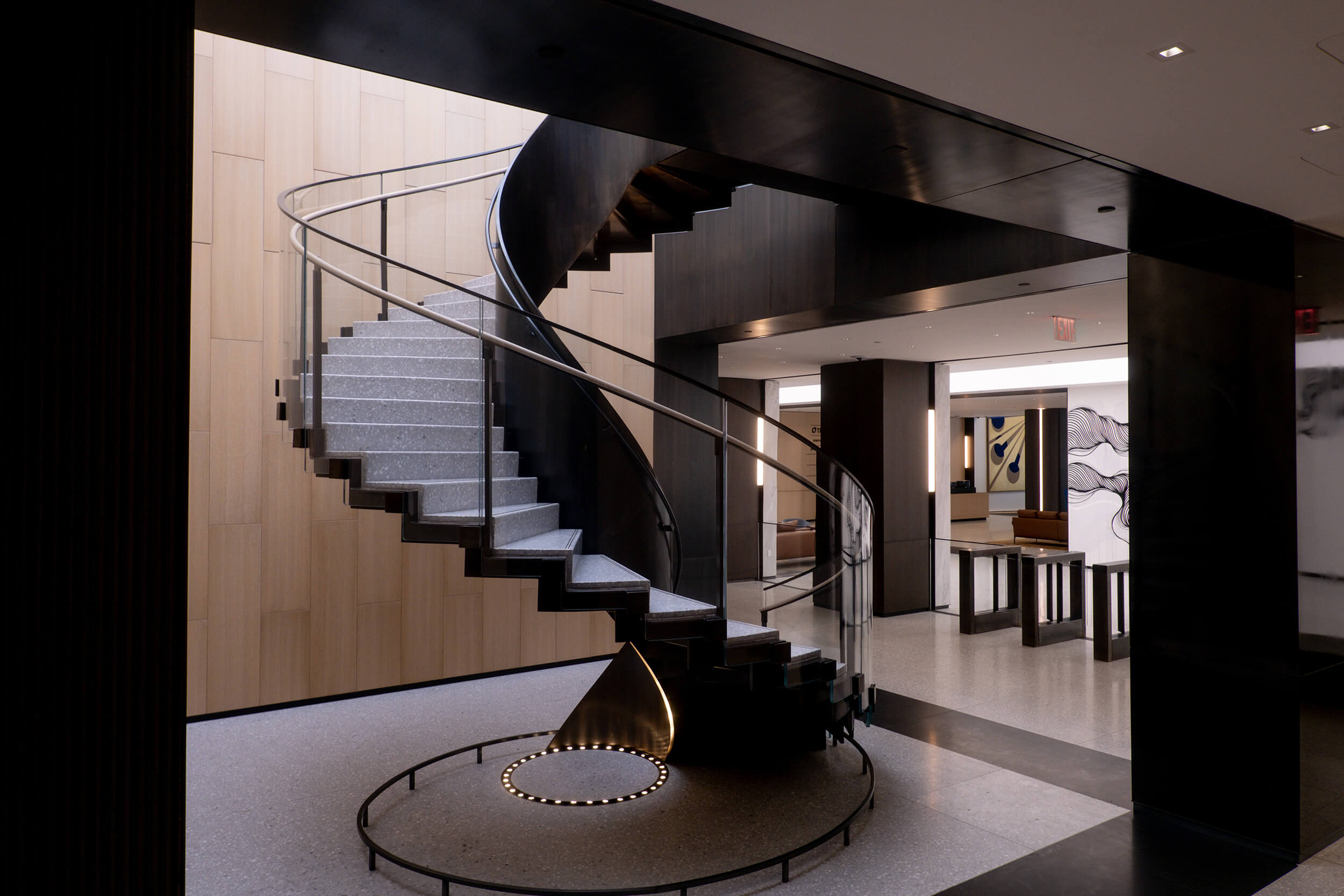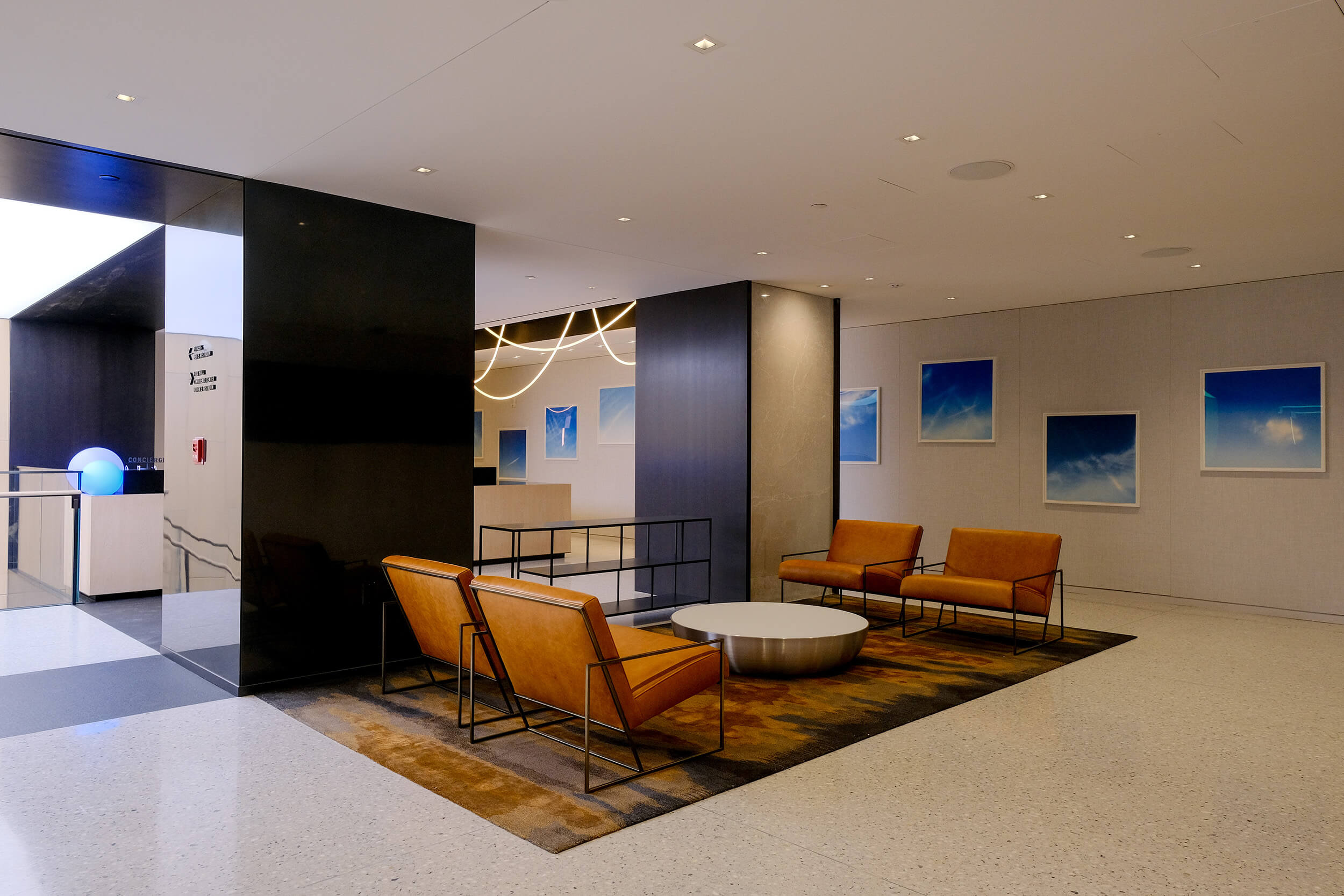 A staffed concierge desk greets the 6,000-square-foot sky lounge, featuring touchdown areas, a double-height balcony overlooking the main lobby, and in-house catering for accelerated productivity.